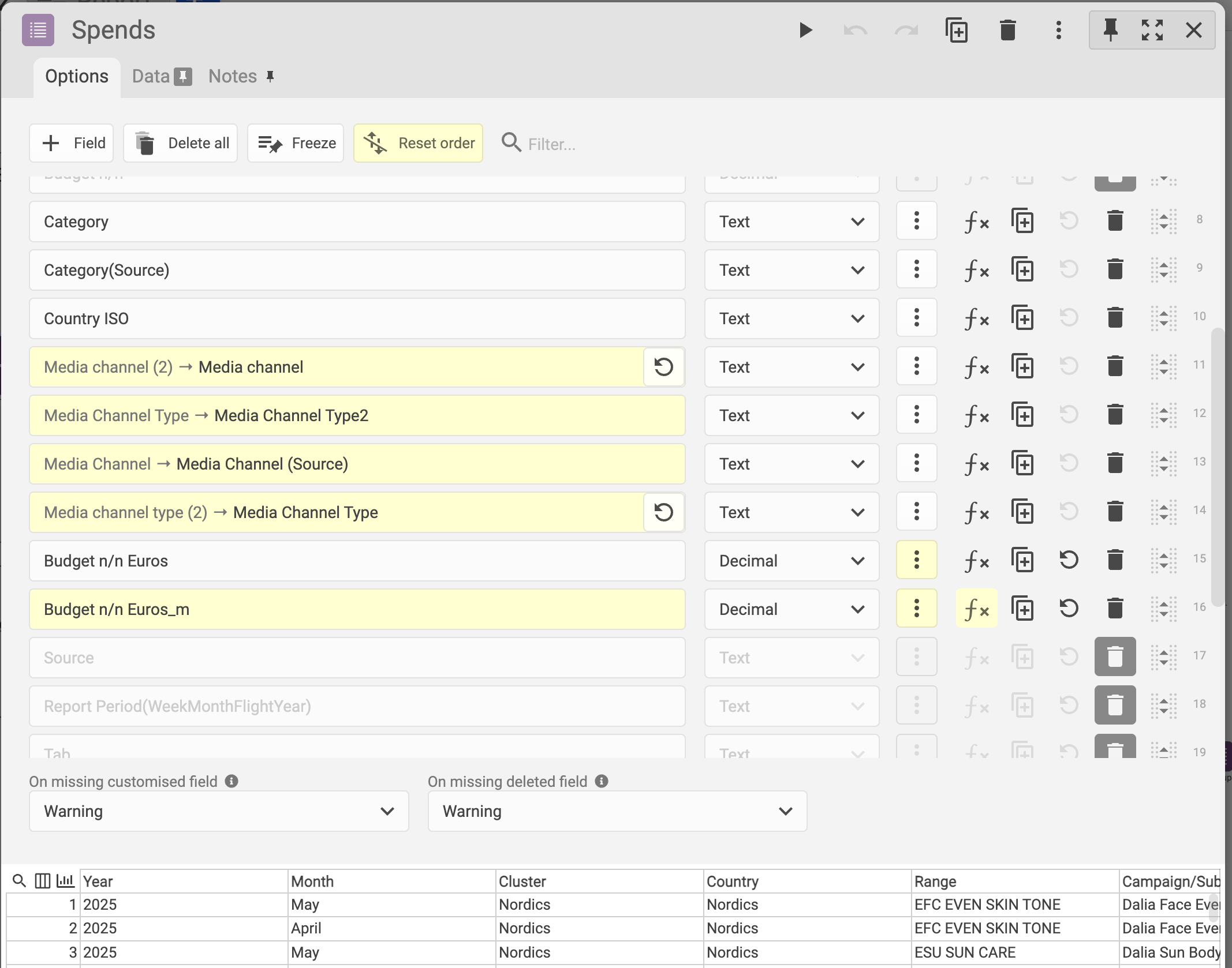 Best practice tip 1: whatever your data source - connect it to a Field Organiser block, where you can see a list of all fields and quickly eliminate unnecessary fields, correct data types, or rename fields.